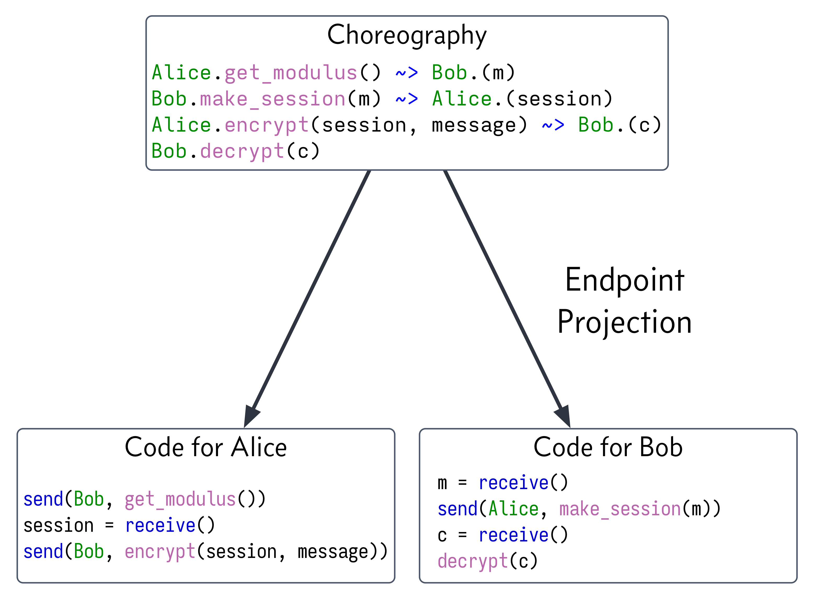 Chorex does all this by leveraging Elixir’s macro system: you write down a choreography using the defchor macro provided by Chorex. The macro expands into several modules: one for each actor in your system. You then create another module for each actor in the system which uses the respective macro-generated module; the macro-generated module handles the communication between the different parties in the choreography, and your hand-written module handles all the internal bits to that node. Let’s look at an example.