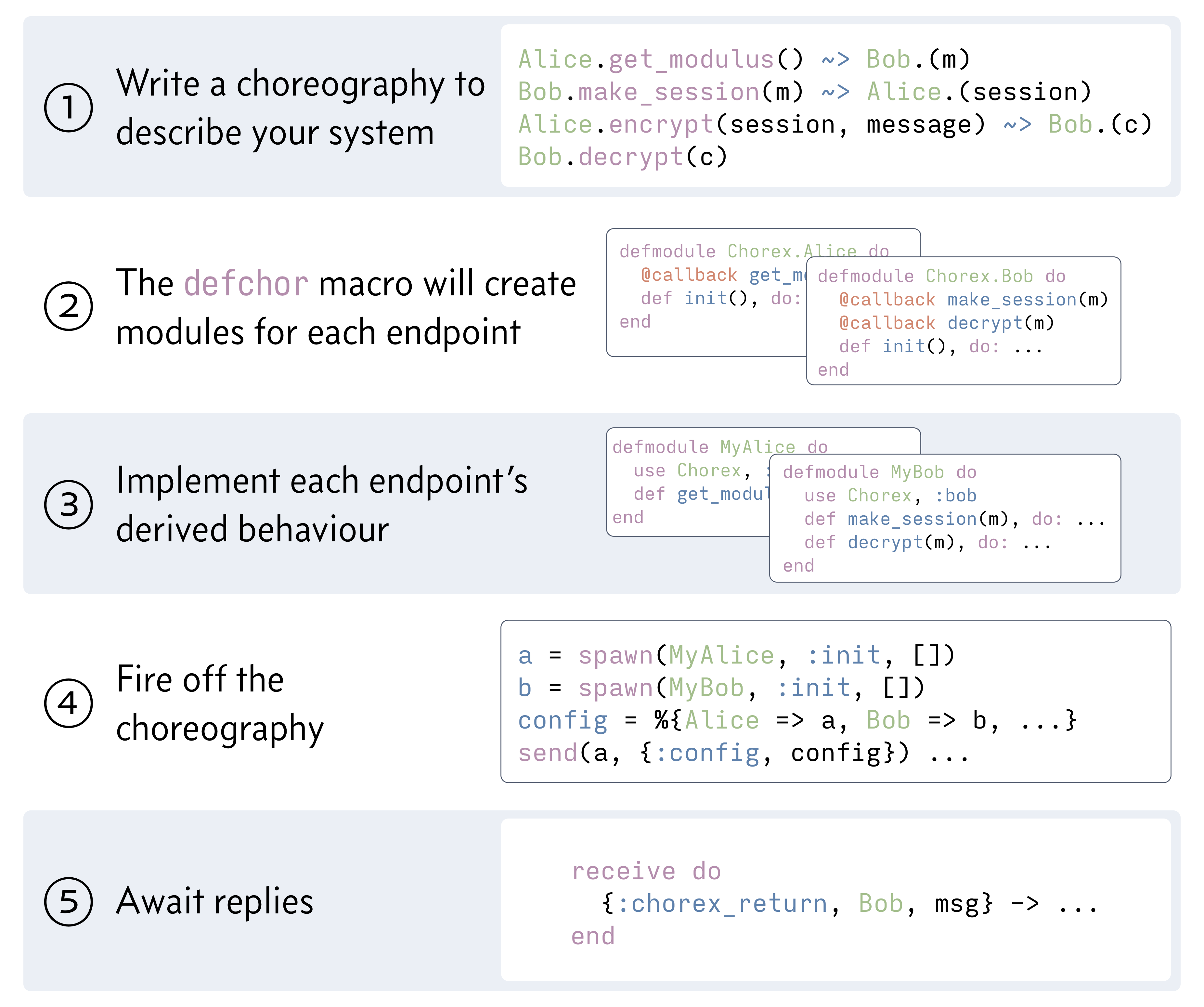 Chorex enables choreographic programming in Elixir. A choreography is a birds-eye view of communicating parties in a concurrent system: you describe the different actors and how they send messages to each other. From this choreography you can create an endpoint projection, which just means you create some code for each of the concurrent actors that handles all the communication.